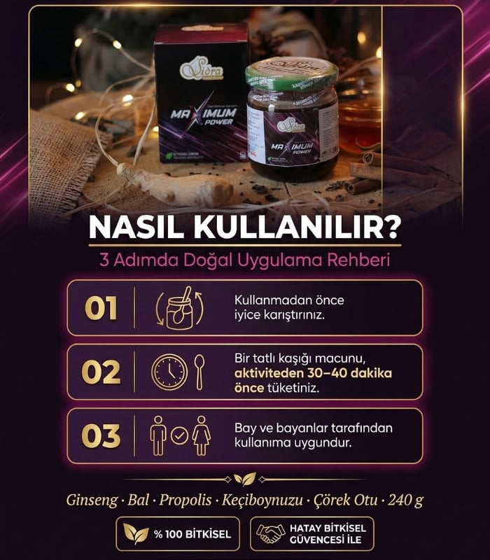 Kullanmadan önce iyice karıştırınız. Bir tatlı kaşığı macunu 30-40 dk öncesinde kullanmanız tavsiye edilmektedir. Bay ve bayanlar tarafından kullanımı uygundur.